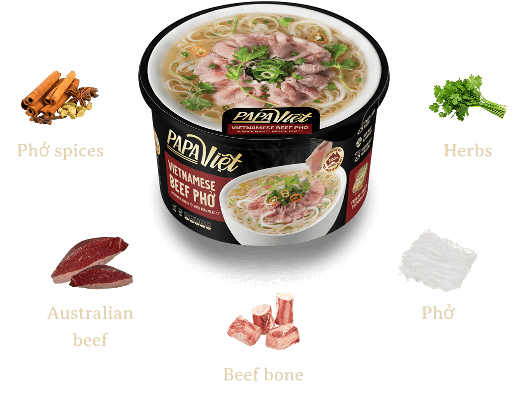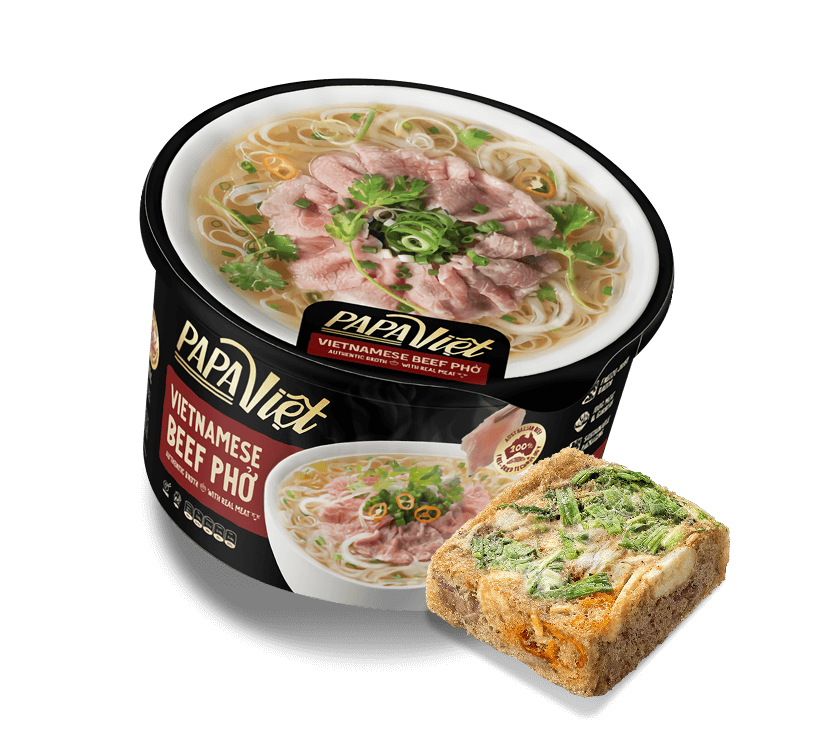 HONEST-TO-VIET’S GOODNESS At Papa Viet, we live by the name of our homeland and carry the mission to preserve the authenticity of Vietnamese cuisine. Made with modern technology and old-school passion for Vietnam's most iconic noodle soup, Papa Viet's Pho is freeze-dried to keep the essence intact. The broth and real meat or veggie pieces are concentrated into a cube, saving the authentic flavor made with signature ingredients.
